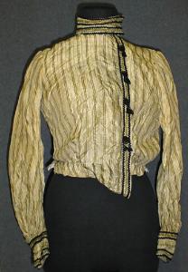 About MuseumFinland![]() | Materiaali: silkki Valmistuspaikka: Vaasa,Suomi Valmistusaika: 1890-1910 Valmistustekniikka: käsin koneella Käyttäjä: Ida Kihlman Asiasana: VIRKKAUS Mitat: Pituus:41cm(keskietu), Pituus:43cm(keskietu), Ympärysmitta:68cm(vyötärö) Museokokoelma: Museokokoelma/Rulludd Vastuumuseo: Espoon kaupunginmuseo Asiasanasto: Espoon kaupunginmuseon sanasto Esineen numero: ECM:15:23 ID: 1523 Raidallinen keltainen silkkikangas, johon ommeltu koneella 2 cm välein hiuslaskoksia.Pitkät alhaalta poimutetut hihat, joiden kalvosimissa mustaa nyörikoristelua. Samaa koristelua edessä halkion reunassa pääntiestä helmaan. Edessä vasemmalla sivulla painonappikiinnitys (10kpl).Jakku on puuvillakankaalla vuoritettu. Vuori kiinnittyy hakasilla jakun etumuksessa. Materiaali:
