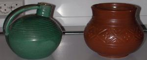 About MuseumFinland![]() | Materiaali: savi Valmistaja: Grankullan Saviteollisuus, Valentina Modig Valmistuspaikka: Grankullan Saviteollisuus Oy,Nuijala,Espoo,Suomi Valmistusaika: 1931-1936 Valmistustekniikka: dreijaus, värisavisilaus, raakapoltto, lasittaminen, maalaus, lasite, lasituspoltto Asiasana: KORISTE-ESINE Mitat: Halkaisija:43mm(suu), Halkaisija:90mm(pohja), Korkeus:148mm, Leveys:160mm Museokokoelma: Museokokoelma Vastuumuseo: Espoon kaupunginmuseo Asiasanasto: Espoon kaupunginmuseon sanasto Esineen numero: ECM:2086:8 ID: 20868 Soikea pallo, keskiviivassa taite. Yläosassa dreijausraitoja, alaosa sileä. Kaatonokassa pyöreä, viisto, matalahko kaula, jossa pyöreä suu,lähtee päältä hiukan sivusta. Kädensija kaarevasti suureunan alta rungon puoliväliin, litteä, alaspäin levenevä. Vihreän turkoosissa värissä sangan alla voimakkaampia kohtia. Ulkopohjassa tuotenumero K 10. Esinetyyppi: Materiaali: