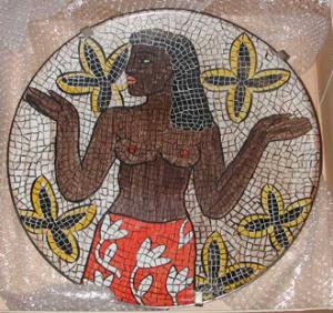 About MuseumFinland![]() | Materiaali: lasi Valmistaja: Kauklahden lasitehdas,Riihimäen lasitehdas, Lyyli Molander Valmistuspaikka: Kauklahden lasitehdas,Kauklahti,Espoo,Suomi Valmistusaika: 1947 Valmistustekniikka: puhallettu, väriopaalia, maalattu Asiasana: KORISTE-ESINE Mitat: Halkaisija:43cm, Korkeus:4cm Museokokoelma: Museokokoelma Vastuumuseo: Espoon kaupunginmuseo Asiasanasto: Espoon kaupunginmuseon sanasto Esineen numero: ECM:2191:1 ID: 21911 Maalattu laakea pyöreä lautanen, johon maalattu voimakkaasti tyylitellen, paksuin viivoin mustaihoinen nainen ja kukkia. Pinta ruudutettu mosaiikkimaisesti. Peltiset kiinnikkeet, joiden varassa ripustustuslenkki. Faarao- ja Afrikka -vaikutteita. Ruskeaihoinen nainen vyötäröä myöten, yläosa paljaana, vartalo kuvattuna edestä, pää vasemmalle kääntyneenä, kädet levitettyinä sivuille kyynärpäistä koholla, musta tukka oikealle olkapäälle, oranssissa vyötäröhameessa valkeita kukkia, ympärillä neliterälehtisiä, ristikukkamaisia kukkia, joissa keltaiset reunat, musta sisus, kukista neljä kokonaista, yksi osittain näkyvissä, reuna ruskea, valkea väri opaalista. Alalaidassa taiteilija Molanderin signeeraus. Esinetyyppi: