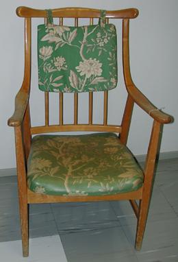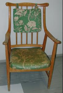 About MuseumFinland![]() | Materiaali: koivu, puuvilla, muovi Valmistusaika: 1950-1959 Valmistustekniikka: teollinen Käyttäjä: Aurorakoti Käyttöpaikka: Aurorakoti,Järvenperä,Espoo,Suomi Asiasana: ISTUIN Mitat: Korkeus:91cm, Leveys:60cm(Leveys käsinojien kohdalta), Syvyys:60cm Museokokoelma: Museokokoelma Vastuumuseo: Espoon kaupunginmuseo Asiasanasto: Espoon kaupunginmuseon sanasto Esineen numero: ECM:2613:12 ID: 261312 Käsinojallinen 1950-luvun tuoli, jossa on pehmustettu istuinlevy. Hartialauta ja selkänojan sivutolpat, jotka samalla jatkuvat käsinojina ovat muotoiltu pyöreäkulmaiseksi. Selkänojassa on viisi pinnaa. Hartialaudassa on kiinnitettynä pehmustettu tyyny, joka on verhoiltu vihreällä puuvillakankaalla, jossa on vaaleita kukkakuvioita. Myös istuinlevy on verhoiltu samalla kankaalla; verhoilukankaan päälle on lisäksi pingotettu muovi. Istuinlevyn pohjassa on näkyvissä harmaa satulavyö. Sivusta katsottuna selkänoja ja takajalat kallistuvat taaksepäin. Tuolissa on sivuilla kaksi alasarjaa. Puuosat on lakattu selluloosalakalla. Esinetyyppi: