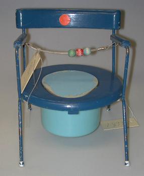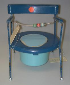 About MuseumFinland![]() | Materiaali: koivu, metalli, muovi, naru Valmistuspaikka: Suomi Valmistusaika: 1960-1969 Valmistustekniikka: teollinen Käyttöpaikka: Suomi,Karamäen päiväkoti,Karamäki,Espoo,Suomi Asiasana: ISTUIN, KÄYMÄLÄ, LASTENHUONE Mitat: Korkeus:32cm, Leveys:28,5cm(selkänojasta), Syvyys:30cm(Takajalasta etujalkaan alaosas) Museokokoelma: Museokokoelma Vastuumuseo: Espoon kaupunginmuseo Asiasanasto: Espoon kaupunginmuseon sanasto Esineen numero: ECM:2668:1 ID: 26681 Lasten pottatuoli, jonka runko (jalat, käsinojat ja selkänojan sivutolpat) on ohutta taivutettua metallia. Jalkoihin on kiinnitettynä sininen puinen istuinlevy, jonka keskellä on reikä ja reijän päällä vaaleansininen puinen kansi. Puisten tukipalojen avulla istuimen alla on irrallinen vaaleansininen muovinen potta, jossa on kädensija. Käsinojien kohdalla metalliin on ruuvilla kiinnitettynä siniset puiset käsinojat. Selkätuki on myös siniseksi maalattua puuta, jonka keskellä on oranssinvärinen pyöreä tarra. Käsinojien väliin on pingotettu toisesta päästään irrotettava naru, johon on pujotettu kolme suurta puista helmeä: vihreä, punainen ja sininen. Metallisten jalkojen päihin on kiinnitetty muovisuojat. Esinetyyppi: