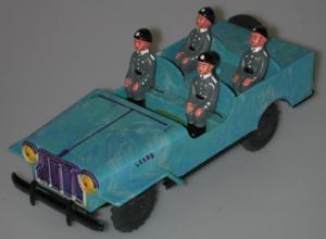 About MuseumFinland![]() | Materiaali: muovi, kumi, metalli Valmistuspaikka: Puola Valmistusaika: 1960-1965 Valmistustekniikka: teollinen, valettu muottiin Käyttäjä: Tom Schmidt Asiasana: KULKUVÄLINELELU, SOTALELU Mitat: Korkeus:9cm, Leveys:9cm, Pituus:21cm Museokokoelma: Museokokoelma Vastuumuseo: Espoon kaupunginmuseo Asiasanasto: Espoon kaupunginmuseon sanasto Esineen numero: ECM:2951:4 ID: 29514 avoin maastoauto on sinistä, marmorikuvioista kovaa muovia. Pohja ja etupuskuri ovat mustaa peltiä, myörät mustaa kumia. Taka-akseli pyörittää hammasrataskoneistoa. Pyörissä lukee: PALART.WROCLAW. Autossa istuu neljä muovisotilasta, joilla on harmaat puvut ja mustat kypärät. Sotilaat on kiinnitetty autoon metallilangalla. Auton perälautaan on kiinnitetty vararengas ja polttoainekanisteri. Auton lamput, etupuskuri ja kanisteri on väritetty huopakynällä. Konepellillä on violetinvärisiä huopakynäviivoja ja pohjaan on kirjoitettu: Jeep. Osia puuttuu (ohjauspyörä, tuulilasi). Esinetyyppi: