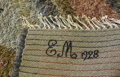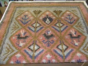 About MuseumFinland![]() ![]() | Materiaali: villa Valmistaja: Elna Malmström Valmistuspaikka: Suomi Valmistusaika: 1928 Valmistustekniikka: käsityö Käyttöpaikka: Suomi,Bensuls,Kauklahti,Espoo,Suomi Asiasana: VUOSILUKU Mitat: Korkeus:232cm, Leveys:190cm Museokokoelma: Museokokoelma Vastuumuseo: Espoon kaupunginmuseo Asiasanasto: Espoon kaupunginmuseon sanasto Esineen numero: ECM:2991:1 ID: 29911 ryijy on kudottu valkaistusta, 12-säikeisestä puuvillalangasta luotuun loimeen, jonka kuteena on luonnonvärinen, 2-säikeinen karstavillalanka ja nukkalankana 2- ja 4- säikeinen karstavillalanka. Loimen tiheys on 2,8 l/cm ja välikuteen tiheys on 4,6 k/cm ja nukkien tiheys 1,4 n/cm. Nukat on solmittu jokaiseen loimilankaan. Nukan pituus juuresta mitattuna 2,5-3,0 cm ja nukassa on 4 lankaa. Ryijyssä on 13 cm levyinen reuna, josta 4 cm tummanharmaat ja 9 cm punaista. Tästä erottuu keskuskuvio omien reunojen avulla, keskustan pohja on vaalea vihertävän sininen. Kuviot vinoneliöitä ja niiden sisällä 5 kuvioaihetta 2 x lintu, kuusi ja 2 x vinoneliötä myötäilevä aihe. Hapsut yläreunassa 6 cm pituiset, alareunassa 8 cm pituiset. Esinetyyppi: