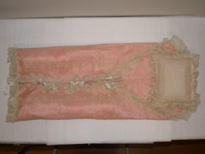 About MuseumFinland![]() | Materiaali: silkki, pellava Valmistusaika: 1770-1790 Valmistustekniikka: käsityötä, nyplätty pitsi, tambourine-kirjailu Käyttäjä: Lovisa Adelborg, Lovisa Leijonhufvud, Ottilia Rålamb, Sofia Ramsay Käyttöpaikka: Esbo gård,Espoonkartano,Espoo,Suomi Asiasana: NYPLÄTTY PITSI, RISTIÄISET Mitat: Leveys:32,5cm(pään kohdalla), Leveys:5cm(pitsi), Pituus:69cm(kankaisen osan, noin), Ympärysmitta:62cm Museokokoelma: Museokokoelma Vastuumuseo: Espoon kaupunginmuseo Asiasanasto: Espoon kaupunginmuseon sanasto Esineen numero: ECM:3422:1 ID: 34221 Vaaleanpunainen kaksinkertainen silkkikantainen vaippa, jonka etuosan liepeet kiinnitetään 3 silkkinauhaparilla, alareuna 2:lla. Vaipan yläosa avonainen, silkkikangas on siltä osin sekä kauttaaltaan näkyvistä osista päällystetty vaalealla harsolla. Harsoon on kirjailtu tambourine-tekniikalla ketjusilmukoita muistuttaen silmu- ja lehvälenkkinauhoja sekä irtokukkia ja pallukoita. Vaipan reunoja kiertää 4 cm leveä pitsinauha, joka kiinnitetty siten, että kumpikin reuna muodostaa röyhelön. Pitsissä tyllipohja jossa kukkia. Esinetyyppi: