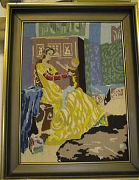 About MuseumFinland![]() | Materiaali: villalankakirjonta, puukehys, kanavakangas, taustapahvi Valmistaja: Aune Lautanen, Matti Lautanen Valmistuspaikka: Suomi Valmistusaika: 1955-1956 Valmistustekniikka: puoliristipistoin kirjottu Asiasana: RISTIPISTOKIRJAILU, TAIDETEOS Mitat: Korkeus:50,5cm(kirjonnan korkeus), Korkeus:62cm(korkeus kehyksineen), Leveys:37,5cm(kirjonnan leveys), Leveys:49cm(leveys kehyksineen) Museokokoelma: Museokokoelma Vastuumuseo: Espoon kaupunginmuseo Asiasanasto: Espoon kaupunginmuseon sanasto Esineen numero: ECM:3525:1 ID: 35251 Ilmeisesti tarvikepakettina kirjottu aihe "Kuningatar Blanka", jossa kuvattuna lapsi naishahmon polvella. Naisella pitkä keltaisen kirjava puku ja pitkät hiukset. Taustalla kuvioituja kirjottuja kuvakenttiä. Lattialla oikeassa alakulmassa laaja ruskean beige alue (talja?).Taulu on kirjottu kuva-aiheeseen nähden vaakatasossa puolipistoin. Piston suunta nouseva. Pohjakankaana kaksilankakanavakangas. Esinetyyppi: