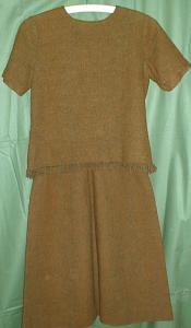 About MuseumFinland![]() | Materiaali: villakangas, ostettu Kalevala-korusta Valmistaja: Greta Kavander Valmistuspaikka: Tuomarila,Espoo,Suomi Valmistusaika: 1960-1965 Valmistustekniikka: kotikoneella käsin Käyttäjä: Elvi Kavander Käyttöpaikka: Tuomarila,Espoo,Suomi Mitat: Pituus:21cm(hihan), Pituus:47cm(puseron etupituus), Pituus:54cm(puseron takapituus), Pituus:64cm(hameen), Ympärysmitta:154cm(hameen helman), Ympärysmitta:66cm(hameen vyötärön) Museokokoelma: Museokokoelma Vastuumuseo: Espoon kaupunginmuseo Asiasanasto: Espoon kaupunginmuseon sanasto Esineen numero: ECM:3561:183 ID: 3561183 pusero-osa:lyhythihainen, kaulukseton pusero, joka kiinnitetään vasemmalta olalta painonapein (3kpl).Puseron helmassa villalangoista kinnitetty smyrnasolmulla hapsurivistö.hameosa:neljästä kaistasta valmistettu tyköistuva hame. Vyötäröhalkio kiinnittyy painonapein (4 kpl) ja kahdella hakasella. Esinetyyppi: