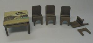 About MuseumFinland![]() | Materiaali: puu, teakiä Valmistusaika: 1940-1950 Valmistustekniikka: teollinen Käyttäjä: Birgit Otterström Asiasana: NUKKEKOTI Mitat: Korkeus:6,5cm Museokokoelma: Museokokoelma Vastuumuseo: Espoon kaupunginmuseo Asiasanasto: Espoon kaupunginmuseon sanasto Esineen numero: ECM:3589:11 ID: 358911 Kolmesta osasta valmistettu, liimaamalla yhdistetty selkänojallinen tuoli, jonka istuinosassa kaksi upotettua mahonki-raitaa. Taaimmaisen raidan takareunasta kulunut pieni pala pois. Esinetyyppi: