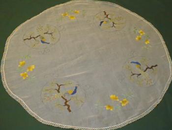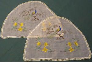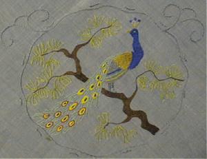 About MuseumFinland![]() ![]() ![]() | Materiaali: lasibatistipohja (puuvilla?) Valmistuspaikka: Suomi Valmistusaika: 1910-1930 Valmistustekniikka: käsin kirjottu Asiasana: KIRJONTA, VARSIPISTO Mitat: Korkeus:33cm(korkeus), Leveys:39cm(leveys) Museokokoelma: Museokokoelma Vastuumuseo: Espoon kaupunginmuseo Asiasanasto: Espoon kaupunginmuseon sanasto Esineen numero: ECM:3593:3 ID: 35933 pannumyssyn muotoon leikatut ja kirjotut kankaat. Koristeena varsipistoin kirjottu riikinkukko oksalla sekä tämän alla molemmin puolin kukkasommitelma. Reunaa kiertää teollisesti valmistettu pitsi. Esinetyyppi: