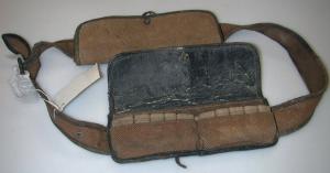 About MuseumFinland![]() | Materiaali: paperikangas, nahka, seosmetalli Valmistuspaikka: Suomi Valmistusaika: 1940-1949 Valmistustekniikka: teollinen Käyttäjä: Gösta Morelius, Per-Olof Morelius Käyttöpaikka: Suomi,Stens gård,Sepänkylä,Espoo,Suomi Asiasana: AMPUMA-ASEET, METSÄSTYS Mitat: Leveys:22,5cm(kotelo), Pituus:117cm(vyö) Museokokoelma: Museokokoelma Vastuumuseo: Espoon kaupunginmuseo Asiasanasto: Espoon kaupunginmuseon sanasto Esineen numero: ECM:3594:110 ID: 3594110 Paperikankainen, nahkapäärmein reunustettu vyö, jossa on kaksi irroitettavaa patruunakoteloa. Patruunakotelot ovat suorakaiteen muotoisia, läpällisiä, jotka on jaettu kahteen eri osaan, joissa molemmissa on paikat viidelle patruunalle. Kotelot on myös valmistettu paperikankaasta ja reunustettu nahkapäärmein, mutta läpän sisäpuoli on valmistettu nahasta ja patruunapaikat leveästä kuminauhasta. Kannen etureunassa on pieni nahkainen pallo, johon kiinnitetään kotelon alareunasta tuleva lenkki. Koteloiden takana on kaksi nahkaista lenkkiä, joiden läpi vyö pujotetaan. Vyössä on nahkapäällysteinen solki ja soljen neula on seosmetallista ja hieman ruostunut. Vyön reiät tuettu seosmetallirenkailla. Esinetyyppi: