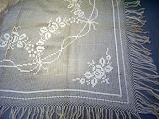 About MuseumFinland![]() | Materiaali: puuvilla, ohut kalalanka Valmistaja: Olga Salokangas Valmistuspaikka: Uusikaupunki, Turun ja Porin lääni, Varsinais-Suomi, Suomi Valmistusaika: 1940-l? Valmistustekniikka: käsityö Käyttäjä: Armi Salokangas Käyttöpaikka: Lahti, Hämeen lääni, Päijät-Häme, Suomi Asiasana: SISUSTUSTEKSTIILI, SISUSTUSTEKSTIILIT Mitat: pituus 140cm, leveys 140cm, hapsut: pituus 13cm Museokokoelma: LAHDEN HISTORIALLINEN MUSEO Vastuumuseo: LAHDEN KAUPUNGINMUSEO Asiasanasto: Lahden kaupunginmuseon sanasto Esineen numero: LKM:LHM:LHM:ES:2000036:40 ID: 200003640 Neliön muotoinen virkattu pitsimäinen liina. jossa kaikilla sivuilla pitkät ja tiheät solmitut hapsut. Esinetyyppi: