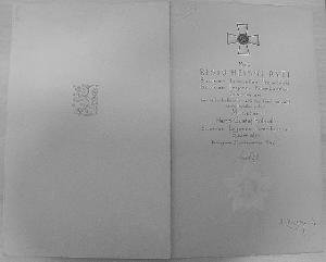 About MuseumFinland![]() ![]() ![]() | Materiaali: suurristi olkanauhoineen: metalli, hopea, emali, kulta, tekstiili, rintatähti: hopea, kultaus, omistuskirja: paperi, tussi, kotelo: pahvi, kangas Valmistaja: A. Tillander, Oscar Pihl Valmistuspaikka: Helsinki, Uudenmaan lääni, Uusimaa, Suomi Valmistusaika: 1943 Valmistustekniikka: suurristi olkanauhoineen: käsityötä, rintatähti: käsityötä, kotelo: tehdasvalmisteinen Käyttäjä: Harri Holma Käyttöpaikka: Uudenmaan lääni, Uusimaa, Suomi Asiasana: KUNNIAMERKIT, RITARIKUNNAT, SUOMEN LEIJONA Mitat: ritarikuntamerkki nauhoineen: korkeus 120mm, rintatähti: halkaisija 100mm, omistuskirja: korkeus 375mm, omistuskirja: leveys 225mm, omistuskirjan kannet: korkeus 370mm, omistuskirjan kannet: leveys 235mm Museokokoelma: LAHDEN HISTORIALLINEN MUSEO Vastuumuseo: LAHDEN KAUPUNGINMUSEO Asiasanasto: Lahden kaupunginmuseon sanasto Esineen numero: LKM:LHM:LHM:ES:4548 ID: 4548 Suurristi olkanauhoineen: Yrjönristi, jonka keskellä Suomen leijona, nauha tummanpunainen muareekäsitelty. Risti kiinnitetty nauhaan metallilenkillä Rintatähti: Viisisakarainen tähti, keskellä pyörellä emaloidulla pohjalla Suomen leijona. Takana neulakiinnitys Omistuskirja: irtokannet pahvia, etukannessa kullanvärinen Suomen Leijona. Kunniakirja 2-sivuinen paperiarkki (vesileima Tervakoski 1940) Kotelo: Suorakaiteen muotoinen, kannellinen kotelo, jossa saranat ja lukitushela. Sisälle koteloon muotoiltu paikat suurristille, nauhalle ja tähdelle. Esinetyyppi: