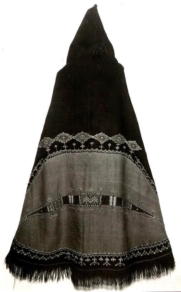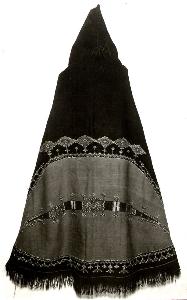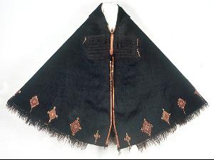 About MuseumFinland![]() | Materiaali: lanka;villa, nahka Valmistuspaikka: Korkea-Atlas, Marokko Valmistustekniikka: käsityö Asiasana: symbolit, tekstiilit, vaatteet, vaipat, berberit, kansat, Pohjois-Afrikka, islamilainen kulttuuri Mitat: leveys:175cm, pituus:160cm Museokokoelma: Yleisetnografiset kokoelmat Vastuumuseo: Kulttuurien museo Asiasanasto: Museoalan asiasanasto, VIT - Vapaan indeksoinnin termi, Yleinen suomalainen asiasanasto Esineen numero: NBA:VK4835:105 ID: 14147 Hupullinen viitta (berb. akhnif, mon. ikhnafen), joka on kudottu tummanruskeaan villaloimeen. Selkäpuolella on hyvin suuri punainen silmäkuvio, jonka keskellä poikittain kulkee monivärinen geometrisaiheinen kudottu kuvioraita. Silmäkuvion on uskottu suojaavan pahalta silmältä. Vaatteen alareunassa on tasaisin välimatkoin toistuvia monivärisiä kudottuja vinoneliöitä, joiden langanpäät näkyvät nurjalla puolella. Rinnan kohdalla molemmin puolin on geometrisaiheiset neliön muotoiset mustalla kirjotut kentät. Etureunat on kantattu punaruskeilla nahkakaitaleilla. Vaate on päälle pujotettava; se on ommeltu kiinni lyhyeltä matkalta rinnan kohdalta. Hupun päästä roikkuu tupsu, ja alareunassa on hapsut. A.O.L. nro 131a Vaatteesta kaavapiirrokset Kultuurien museon arkistossa. Esinetyyppi: