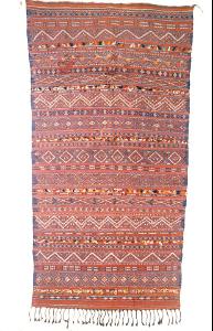 About MuseumFinland![]() | Materiaali: lanka;villa Valmistuspaikka: Marokko Valmistustekniikka: käsityö Asiasana: peitteet, satulahuovat, symbolit, tekstiilit, vuodevaatteet, berberit, kansat, Pohjois-Afrikka, islamilainen kulttuuri Mitat: leveys:125cm, pituus:244cm Museokokoelma: Yleisetnografiset kokoelmat Vastuumuseo: Kulttuurien museo Asiasanasto: Museoalan asiasanasto, VIT - Vapaan indeksoinnin termi, Yleinen suomalainen asiasanasto Esineen numero: NBA:VK4835:120 ID: 14177 Tummanruskeaan villaloimeen kudottu kuderipsisidoksinen peite (arab. l-handira), johon on kuvioitu värikkäillä lisäkuderaidoilla geometrisia kuvioita, mm. neliöitä, vinoneliöitä ja siksak-linjoja. Joukossa on myös monivärisiä kapeita solmittuja nukkaraitoja. Kuvioiden, kuten siksak-linjojen ja silmää symboloivien vinoneliöiden, on uskottu suojaavan pahalta silmältä. Kudonnaisen pohjaväri on punaruskea. Alapäässä on loimilangoista muodostettu palmikkohapsutus, yläpäässä loimilangat on päätelty tiilenpunaisen lisälangan avulla palmikoimalla. Yläpäässä on myös metallirenkaita. Tekstiiliä on korjattu puuvillakangaspaikoilla nurjalta puolelta. A.O.L. nro 131a Esinetyyppi: