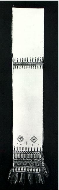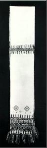 About MuseumFinlandMateriaali: lanka;puuvilla Valmistuspaikka: Meknès Valmistustekniikka: käsityö Asiasana: kirjonta, symbolit, tekstiilit, Pohjois-Afrikka, islamilainen kulttuuri Mitat: leveys:22cm, pituus:245cm Museokokoelma: Yleisetnografiset kokoelmat Vastuumuseo: Kulttuurien museo Asiasanasto: Museoalan asiasanasto, Yleinen suomalainen asiasanasto Esineen numero: NBA:VK4835:141 ID: 14203 Pitkä kapea luonnonvalkoinen palttinasidoksinen puuvillakudonnainen, jonka päissä ja keskellä kahdessa kohdassa on kirjontavyöhykkeet. Geometrisaiheinen ristipistokirjonta on ommeltu punaisella ja sinisellä puuvillalangalla. Päiden yhtenäisen kirjontavyöhykkeen jälkeen on rinnakkain kahdeksansakaraiset tähdet, jotka on kirjottu etupistoin punaisella ja sinisellä langalla. Päissä on punaiset ja keltaiset puuvillalankahapsut. Kahdeksansakaraisen tähden on uskottu suojaavan pahalta silmältä. A.O.L. nro 131b Esinetyyppi: