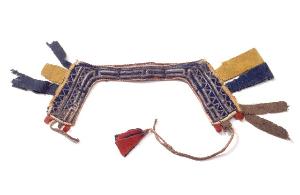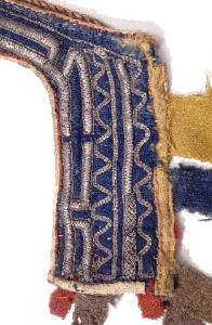 About MuseumFinland![]() ![]() ![]() | Materiaali: kangas;villa Valmistustekniikka: käsityö Asiasana: jokilappalaiset, pangat, poronpäitset, poronvaljaat, päitset, saamelaiset, suomalais-ugrilaiset kansat, tunturilappalaiset, valjaat Mitat: korkeus:18cm, leveys, pienin:36cm, leveys, suurin:55cm Museokokoelma: Suomalais-ugrilaiset kokoelmat Vastuumuseo: Suomen kansallismuseo Asiasanasto: Museoalan asiasanasto Esineen numero: NBA:SU5297:3 ID: 34567 Poronpäitset. Sinistä, keltaista ja punaista kangasta, koristettu tinalangasta sommitelluin kuvioin, nahalla vuorattu. Yhdestä kappaleesta ommeltujen päitsien kapea keskiosa tulee poron otsalle leveämpien reunaosien asettuessa pään sivuille . Päitsien pohjana on sininen verka, joka on koristeltu tinalankakirjonnalla. Tausta on vuorattu nahalla. Päällisen ja taustan väliin siuvukappaleiden ulko- ja alareunoihin on kiinnitetty suorakaiteen muotoisia, erivärisiä verkasuikaleita. Päitsien yläkulmia yhdistää ilmeisesti poron korvien takaa kulkeva kierretty nahkanyöri. Sivukappaleiden alareunoissa on nahkanyörit (ohuet nahkapalmikot on päällystetty nahkasuikaleella), joista toinen on katkennut. Ehjä nyöri (pituus 35 cm) jakautuu alapäässä kahdeksi ja molemmissa päissä on alunperin ilmeisesti ollut erivärisistä kolmionmuotoisista verkatilkuista tehdyt tupsut. Vain toinen tupsuista on jäljellä. Esinetyyppi: