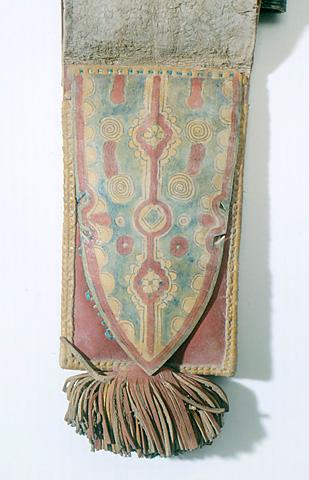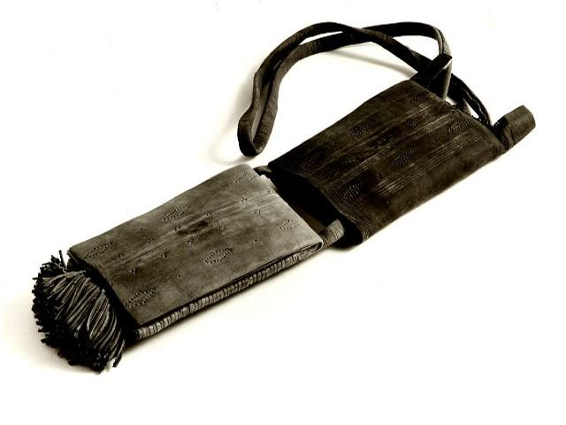 About MuseumFinland![]() | Materiaali: nahka Valmistustekniikka: käsityö Asiasana: nahkatyöt, rahakukkarot, symbolit, tupakkakukkarot, arabit, kansat, berberit, kansat, marihuana, huumeet, Pohjois-Afrikka, islamilainen kulttuuri Mitat: korkeus, suurin:88cm, leveys:11,5cm Museokokoelma: Yleisetnografiset kokoelmat Vastuumuseo: Kulttuurien museo Asiasanasto: Museoalan asiasanasto, VIT - Vapaan indeksoinnin termi, Yleinen suomalainen asiasanasto Esineen numero: NBA:VK4835:36 ID: 14012 Punaisesta nahasta ommeltu suorakulmainen kukkaro (arabiaksi l-mutwi tai l-qraba, shelhaksi tashkart), jossa on pitkä kantohihna. Kukkaro on mustassa nahkakotelossa, jonka päällipuolelle on leimattu vinoneliöitä ja pystysuoria linjoja. Keskellä on punaisella nahkasuikaleella kirjottu vinoneliö, ja yläreunan sauma on ommeltu vihreällä nahkanauhalla. Kukkarossa on pitkittäin viisi taskua, joista kolmen alimmaisen takaseinä jatkuu eteen taipuvana suorakulmaisena läppänä siten, että takimmaisen taskun läppä muodostaa kukkaron etupuolen. Läpät on koristeltu painetuin pystysuorin linjoin ja yksinkertaisin maalauskuvioin. Kaksi päällimmäistä taskua on ommeltu peittämään teräväkärkinen kolmiomainen läppä, johon on maalattu punaisella ja vihreällä ornamenttikuvioita, mm. kahdeksanterälehtisiä kukkasymboleita. Alareunassa on suuri nahkatupsu, jonka avulla kukkaro vedetään ulos kotelostaan. Kahdeksanterälehtisen kukan, kaksinkertaisen viitoskuvion, uskotaan tuovan onnea ja suojaavan esinettä ja sen sisältöä pahalta silmältä. A.O.L. nro 131a Esinetyyppi: